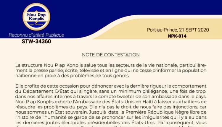Dans une note de presse acheminée à la rédaction de La Brève Info, la structure Nou Pap Konplis dénonce avec la dernière rigueur le comportement du Département D’État qui  selon lui s’ingère sans un minimum d’élégance, une fois de trop, dans les  affaires internes du pays à travers son compte tweeter de son ambassade dans le pays. Nou Pap Konplis exhorte l’Ambassade des États-Unis en Haïti à laisser aux haïtiens de résoudre les problèmes du pays.