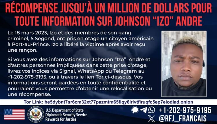 Les États-Unis ont annoncé une récompense pouvant atteindre un million de dollars pour toute information permettant la capture de Johnson André, alias « Izo », chef de gang opérant à Port-au-Prince.